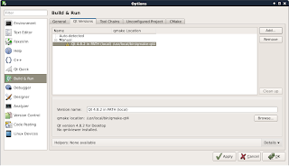 まず、コンパイラ関連の設定をする。メインウィンドウの[Tools-Options]でオプションダイアグを開き、ダイアログ左の一覧から「Build & Run」を選択して、「Qt versions」タブを選択。ダイアログ右にある「Add」ボタンをクリックして、先ほどインストールしたQt4本体に含まれる、「qmake-qt4」のPATHを指定します。デフォルトなら、「/usr/local/bin/qmake-qt4」です。